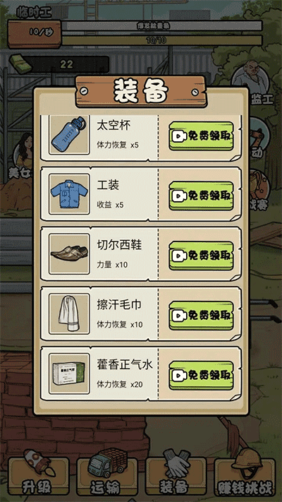 通过完成一系列任务并增加工作量可以获得更多报酬,获得各种设备,在持续的训练下提高搬砖的实力,获得执行任务的丰富回报。