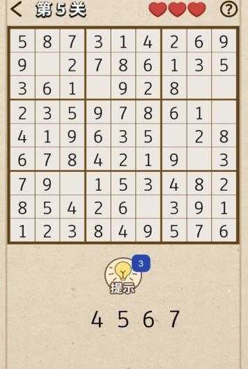游戏采用数独玩法,玩家在游戏中需要填写关卡内的数字完成数独问题,