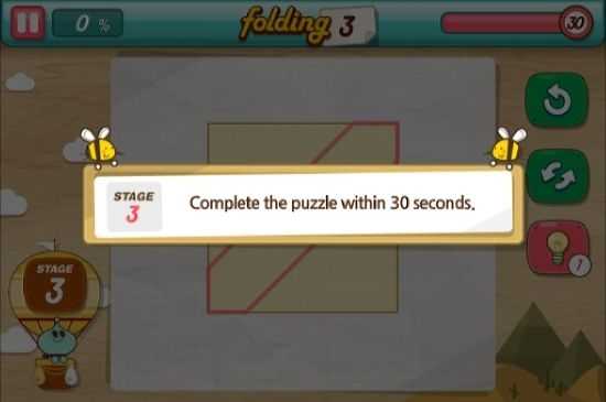 一款考验智商和动手双项能力的益智游戏,玩法很简单,在规定的时间内,将白纸全部折进红线的框内即告胜利。游戏操作很简单,点击白纸任一部分拖动到相应位置松开,完成折纸,淡然你还可以再次,但要注意时间。游戏的规则简单,操作也简单,玩家可以在游戏中体验到难得的宁静,只有你和屏幕中的纸张在轻柔的互动,适合喜欢悠闲轻松手游的玩家。