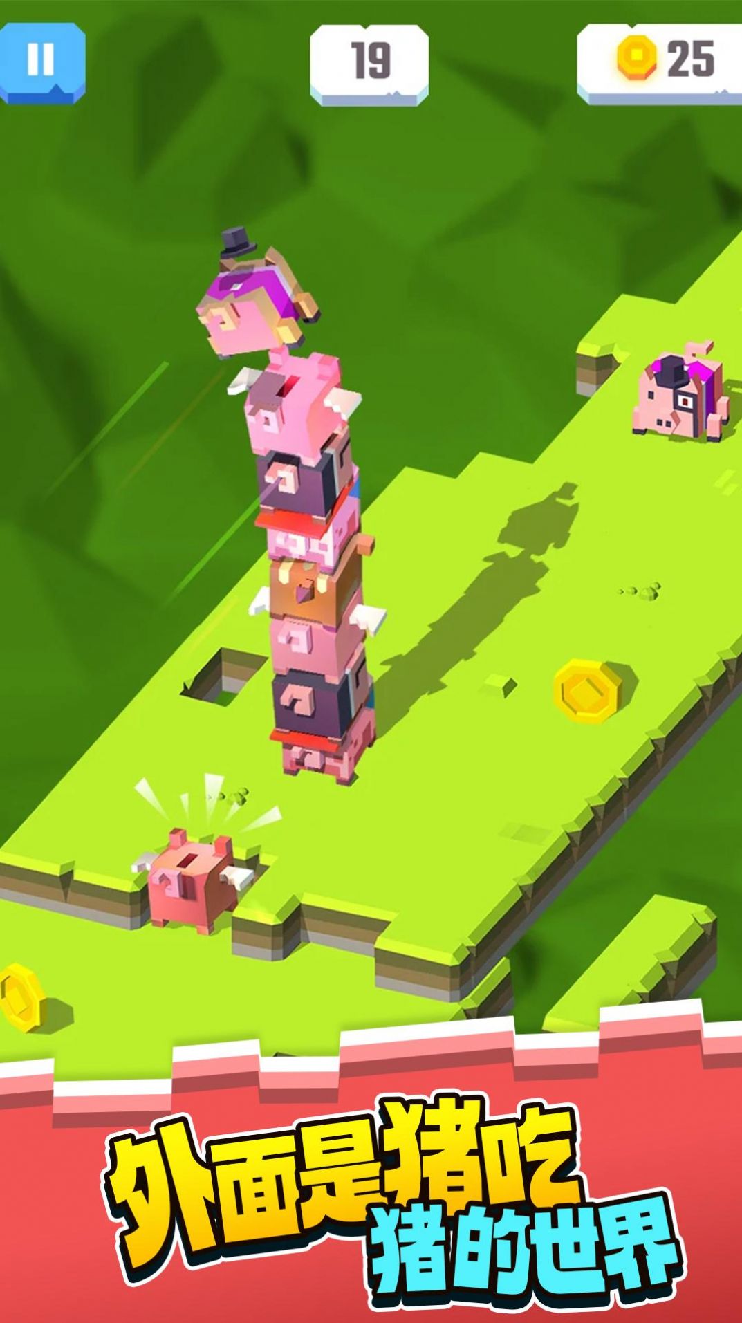 3、当小猪落地时,尽量让它踩在其他小猪上,这样就能更高地叠起来。