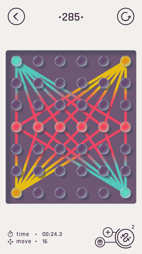 玩家需要在游戏中连接点与点,颜色需要匹配,并让整个画面对称,难度会逐渐的提升,逐步掌握之后你可以完成多样的关卡挑战不要停。