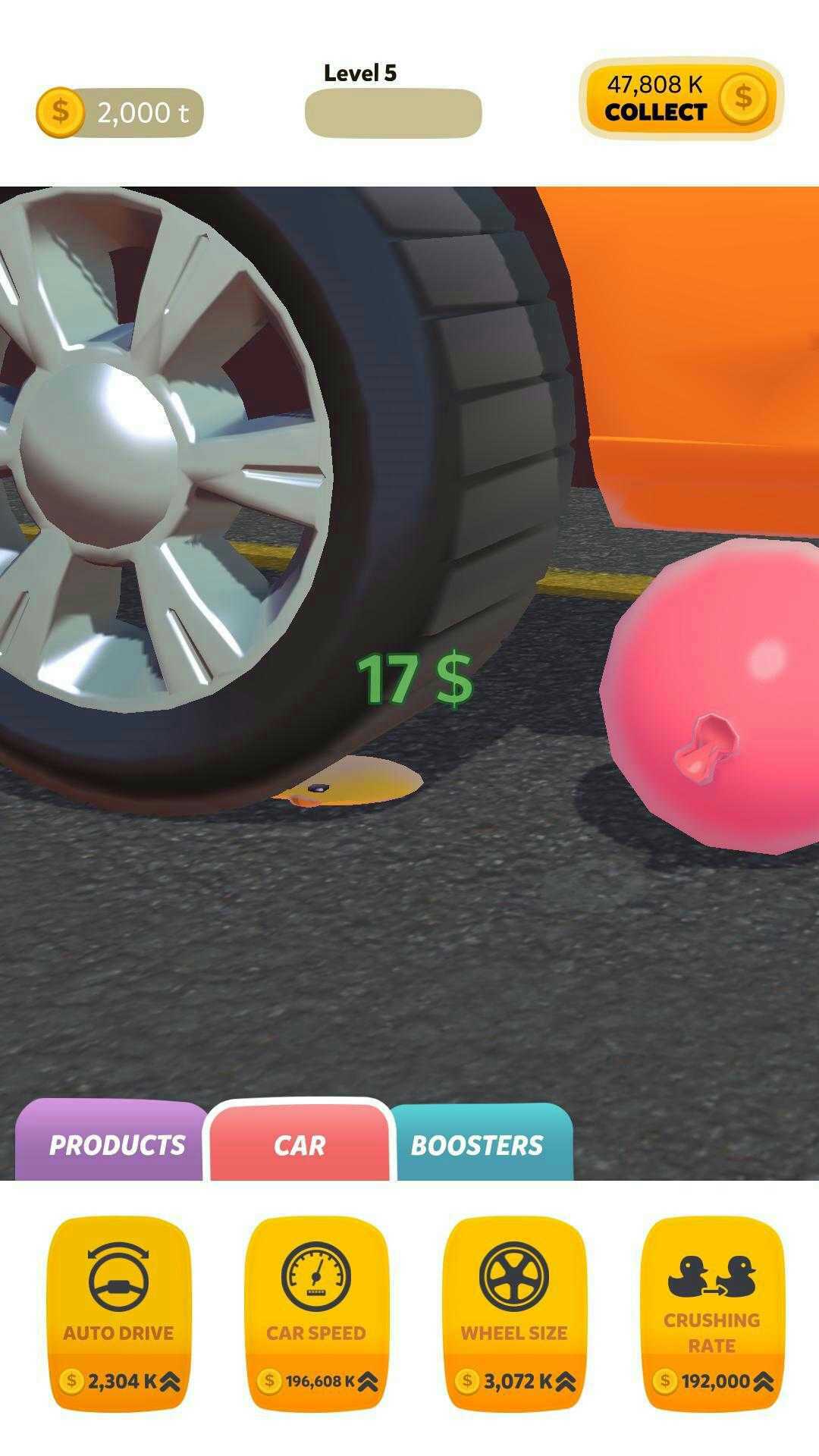 3、简单放松的点击放置类游戏玩法,汽车轮胎碾压各种不同的物品来获取金币并达到减压的目的。