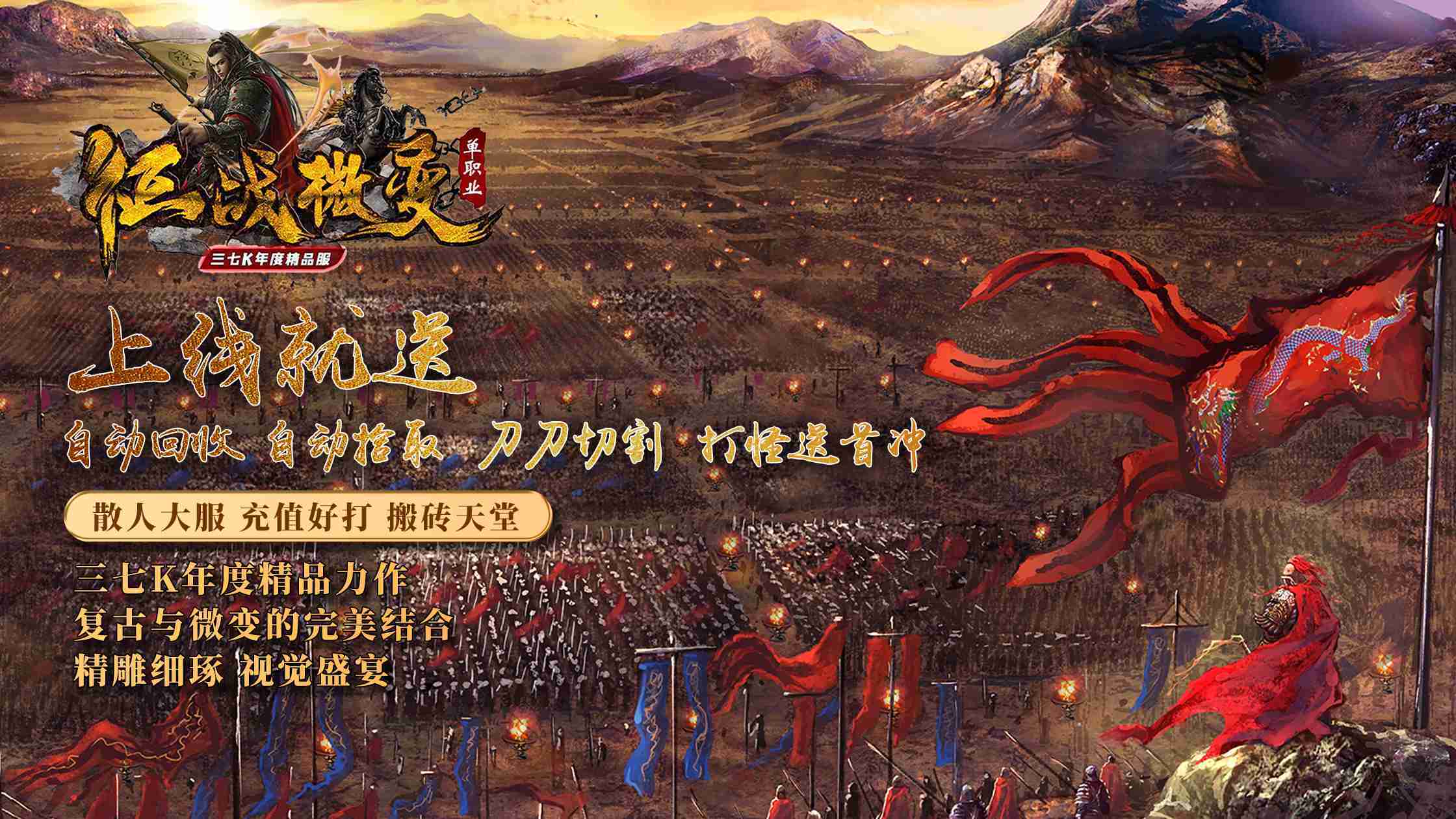 本服为180微变单职业新版本,三七K年度精品散人大服,游戏精打细磨,玩法简单易懂、充值好打、节奏舒适、强势推流!上线就送自动回收、自动拾取、刀刀切割、首冲打怪就送,单职业战士群怪彻地钉(仅对怪),所有装备均可回收元宝,高级装备保底军饷回收,打击感超强.一个顶赞即可超爽畅玩.难得一见的搬砖好服!