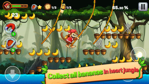 2、在游戏中,玩家扮演一只可爱的猴子在各种关卡中奔跑、跳跃、躲避障碍物等,体验极限快感和冒险刺激。