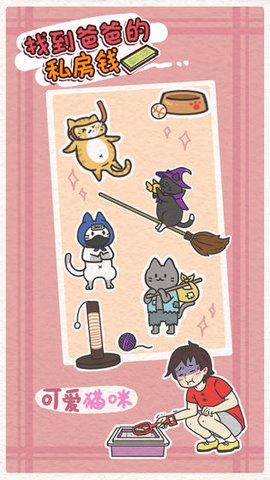 找到爸爸的私房钱是一款非常好玩的手机解密闯关游戏,这款游戏的玩法背景故事非常的休闲,玩家们需要扮演一个调皮的小孩在家里寻找各种爸爸私藏的四私房钱来占为己有,看爸爸可怜巴巴的样子,自己私房钱没了却又不能声张,非常的好笑,游戏采用卡通的游戏设计,各种趣味的玩法给你带来超多的游戏快乐。
