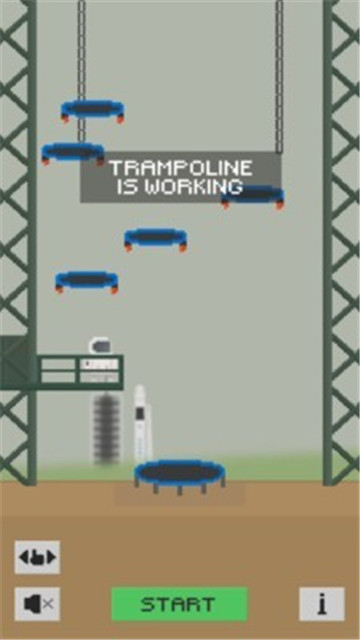 蹦床在工作是一款非常有趣的手机跳跃闯关游戏,这款游戏的设计背景非常的有趣,玩家们要在这里控制你的太空人弹跳到火箭当中上去,顺利的乘坐自己的火箭非常太空,游戏玩法以及设定都非常的简约,玩家们只需要踩到蹦床胜利的跳起就能够获得游戏积分,看玩家们能够坚持多久,赶快下载体验吧。