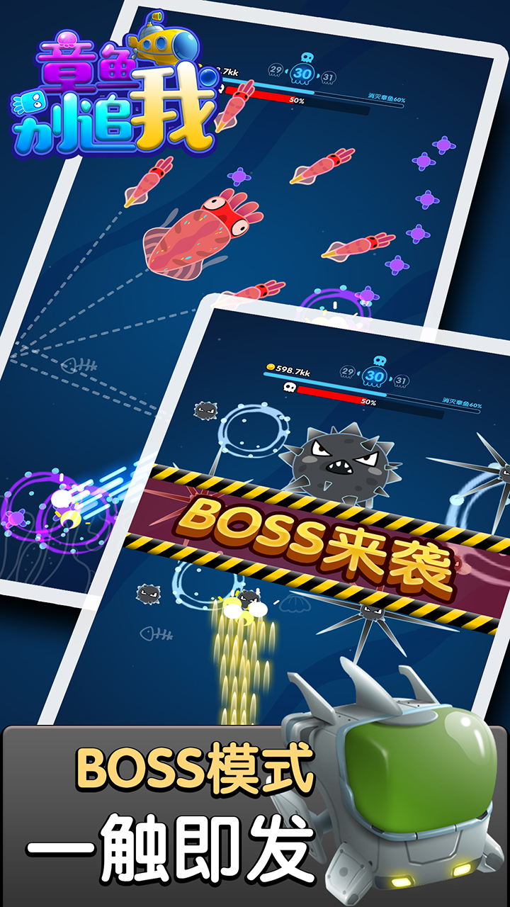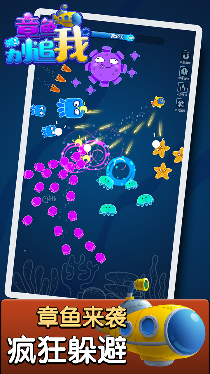 章鱼别追我是一款非常好玩的手机割草游戏,这款游戏采用海底的样式为故事背景,在这里玩家们要在海中驾驶自己的潜艇来与各种的海底生物进行大战,玩家们需要面对成群的海底生物,同时你需要运用灵活的走位,强大的射击弹幕来消灭他们,游戏拥有超多的关卡挑战,各种不同的强化道具等你使用,赶快体验吧。
