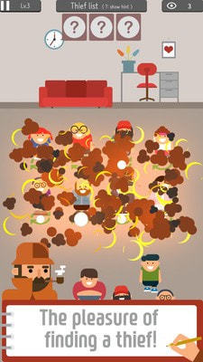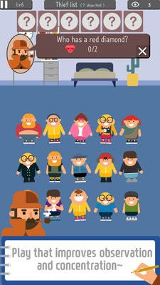 采用了清新卡通的画风打造,而且简洁的画面一目了然,玩家将会称为一名侦探进行查探失窃的案件,通过一些嫌疑人留下的蛛丝马迹来找到真正的犯人,不过小心犯人会随时变换位置,一定要紧紧地盯着动向,然后一举抓获,成功过关,非常考验耐心和观察力,快来享受成侦探破案的成就感和快感。