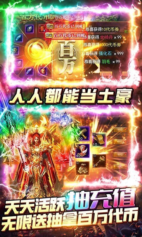 5.累积抽奖必送百万代币,最强合击版本,轻松秒怪刀刀光柱。充值比例1:5000!